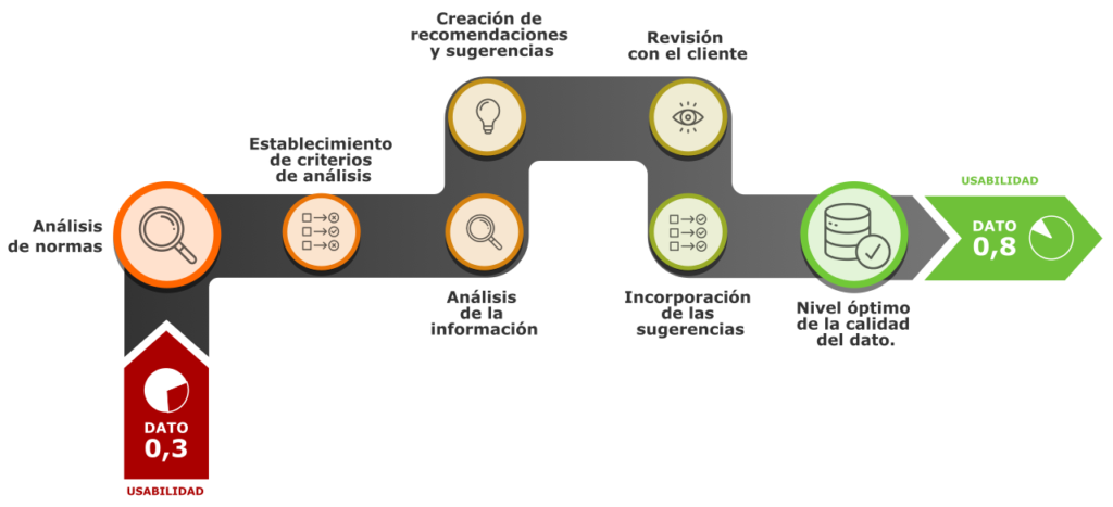 Para cada categoría se definieron una serie de elementos de análisis que en total suman 47 ítems. El objetivo final de esta revisión fue cuantificar la usabilidad de la información geográfica producida, estableciendo un rango de usabilidad. Este rango va entre -1 y 1, siendo los valores cercanos a -1 aquellos que incumplen en más de un 50% los elementos establecidos para el análisis y los valores cercanos a 1 aquellos que cumplen en más de un 50% los elementos. De esta forma se obtuvo un resultado parcial de usabilidad por capa y un resultado global de usabilidad para el conjunto de datos. Luego de haber realizado el análisis, se confrontaron los resultados obtenidos con lo establecido por las normas, de esta manera se creó un documento de recomendaciones y sugerencias para la mejora de la calidad e interoperabilidad del dato.